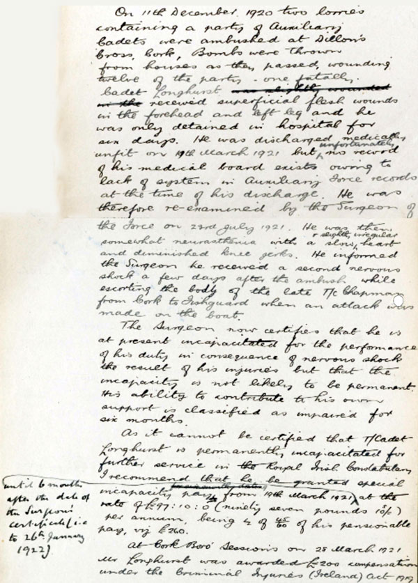 1920 Dec 11. The best known reprisal in Ireland by the Auxiliary Division was the burning of Cork. At 7:30 p.m. that evening, a truckload of Auxiliaries from newly-formed K Company was ambushed at Dillons Cross: a grenade was thrown onto their truck, wounding ten Auxiliaries and killing one, T/Cadet Chapman. Later that night, police and Auxiliaries took revenge by setting fire to the city's commercial centre, preventing the fire service from attending the blaze, and shooting seven people. W Longhurst was on the patrol that was ambushed. His record shows he was wounded then and discharged medically unfit as a result
