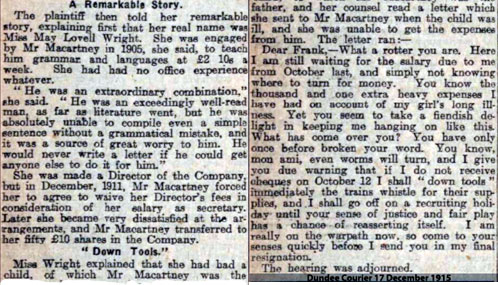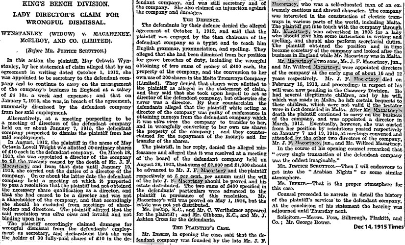 1915 Dec/Jan One gets the best view of the affairs of Macartney & McElroy from the court case that the Company Secretary Brought against it when she was dismissed.