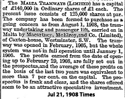 1908 Jul 21. Malta Tramways floated. The shares were being sold by Macartney, McElroy & Co, in which J F Maccartney owned 51.6% and J A McElroy 40.5 % of the shares.