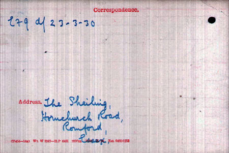1930 Mar 23 Living at Hornchurch Road, Romford , Essex when he applies for medals