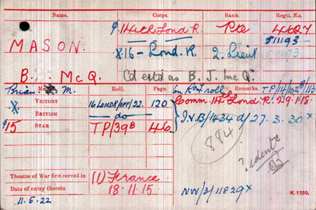 1918 Jan 30 From Officer Cadet Unit, commissioned 2nd Lt in London Regt Brian McQueen Mason