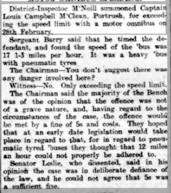 1926 Mar 20 Summoned for speeding in Portrush while driving a bus.