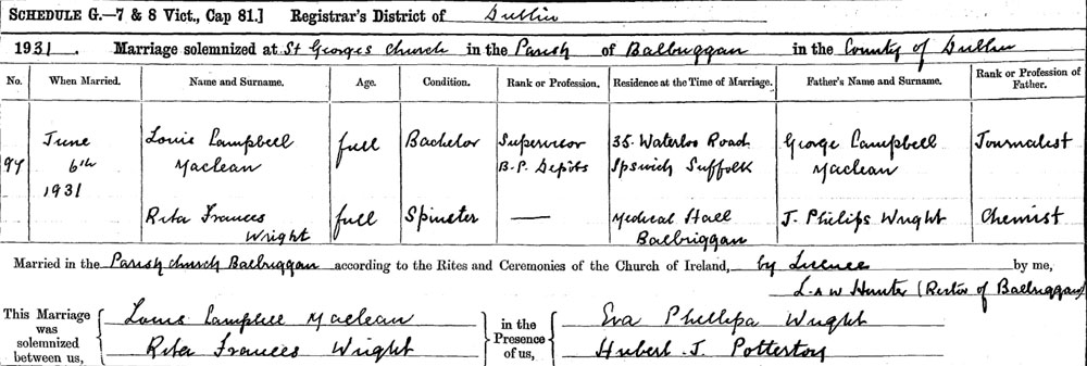 1931 Married in Dublin to Rita Campbell Wright