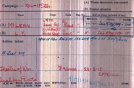 1915 Oct 14. The Leicestershire Regiment. The undermentioned Second Lieutenants to be temporary Lieutenants. — Louis C. McLean, and to remain seconded