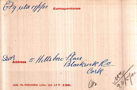 1914 Dec 19. Enlists. His address is 2 Lucan Place, Western Rd, Cork. He gives his age as 38, implying a birth in 1876