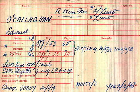 1919 Jan 7. R. Mun. Fus. Temp. Lt. E. O'Callaghan relinquishes his commission on account of ill-health caused by wounds, and retains the rank of Lt