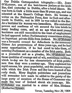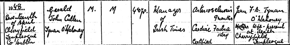 1948 Apr 17. He died at his home in Dublin. The Irish Times naturally ran an obituary, which stated that O'Mahony was manager of the Irish Times from 1942 until he resigned, because of prolonged ill-health, a few months before his death.