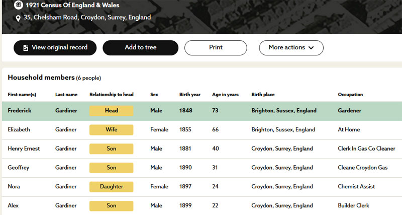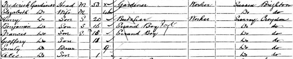 We may be looking at an alias here. He appears out of nowhere with an address in Croydon. Mrs Gardiner may well be his mother. He could be Benjamin Gardiner, who is the only one of the children whose age fits. But that man died in 1916. So it could be Francis