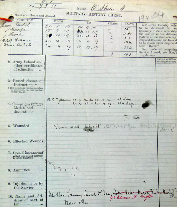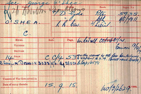 1914 Apr 20 Discharged at end of service from Reserves. He puts his mother as Fanny Sarah O'Shea, living in South Africa.