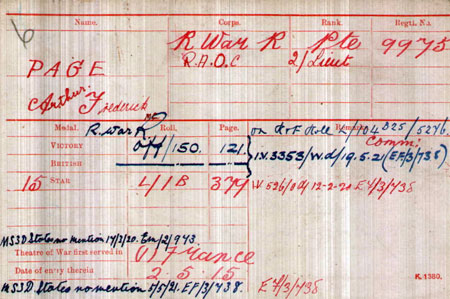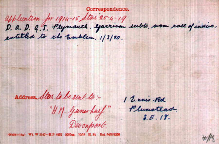 1919 Apr 25 Applies for medals from HM Gunwharf, Devonport. He was with RAOC at this time as that was where guns tested by RAOC for the navy were then mounted in navy ships.