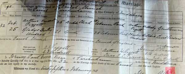1911 Jan/Mar Married in Middlesex to Gladys D Undrell (or Untrett). He is a "clerk"