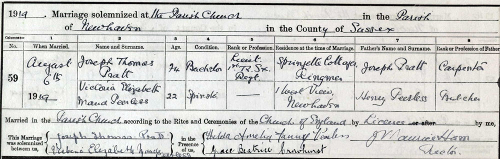 1919 Aug 16 Marriage • Newhaven, Sussex, to Victoria Elizabeth Maud Peerless
