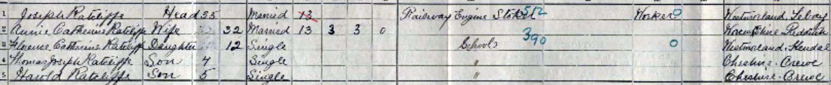 1939 Register at 21 Ashbourne Road, Eccles, Eccles M.B., Lancashire, England. With wife Annie C Ratcliffe. Gives his dob as 19 Apr 1875 but it is our man. A Railway Engine Driver.