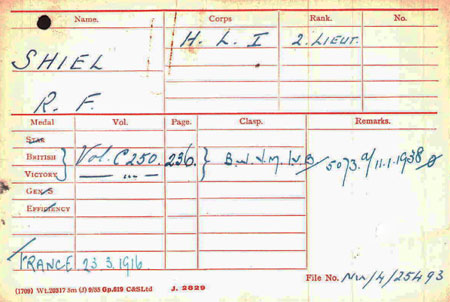 1915 Jul 1. Commissioned 2nd Lt in HLI Richard Francis Shiel