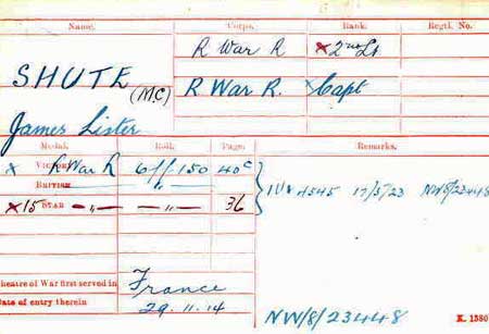 1916 May 16. MC Gazetted. Lt. James Lister Shute, 3rd Bn. (attd. 1st Bn.), R. War. R. For conspicuous gallantry. He led a raiding party into the enemy's trenches in broad daylight, and after accounting for several of the enemy skillfully withdrew with only one slight casualty.