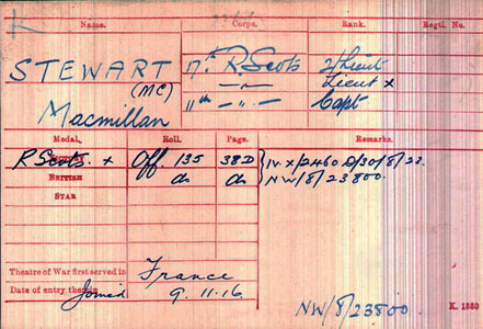 1918 Apr 5. Citation for MC gazetted.. 2nd Lt. Macmillan Stewart, R. Scots. For conspicuous gallantry and devotion to duty. He took command of his company when all the other officers became casualties, rallied his men, and led them into their position under heavy machine-gun fire. He set a splendid example of cheerfulness and courage to his men