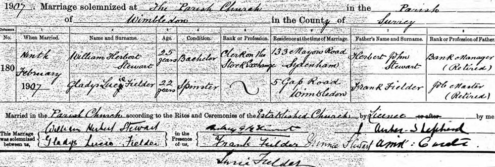 1907 Feb 9. Married Gladys Lucy Fielder (she died in 1926)