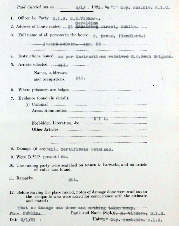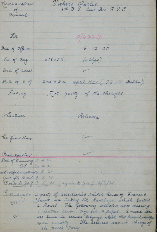 1921 Apr 2. Dist-Inspector,Charles Vickers, courtmartialed for " Larceny and Receiving" Found Not Guilty. Mrs Ceannt was the widow of Eamonn Ceannt who was shot by the British following the Easter Rising in 1916 - it is impossib;le to say what bearing this had on the case. The Court Martial says that a music case was found in Vicars' lodgings. Mrs Ceannt does not appear to have included it on the list of missing items, but did identify it as hers when she was shown it. You can argue that she would identify it as hers wouldn't she, or equally well that she could not be aware of all the small things that might have been stolen on a raid. What one can say is that the ADRIC do not appear to have returned him to rank of DI3 and he leaves ADRIC 2 months later