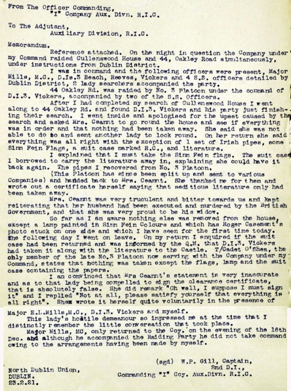 1921 Feb 23. WP Gill Commanding I Coy, sends a memo to Adjutant ADRIC outlining what happened during the raid. (see Dec 16 raid above)
