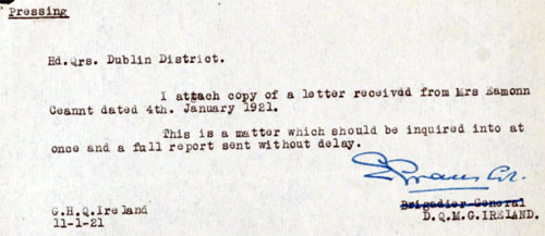 1921 Jan 4 Mrs Ceannt sends letter to Dublin Castle. The letter cannot be found in the files