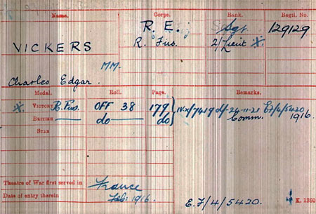 1916 Aug 8. MM gazetted - 129129 Sjt. C. E. Vickers, R.E. I recall it was awarded when a gas canister landed in his trench and he carried it to no man’s land and pumped some shots into it, thereby saving the men in his trench." The medal engraved 129129 SJT. C. E. VICKERS 4 / SPEC BDE. R.E. is still in the family