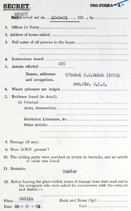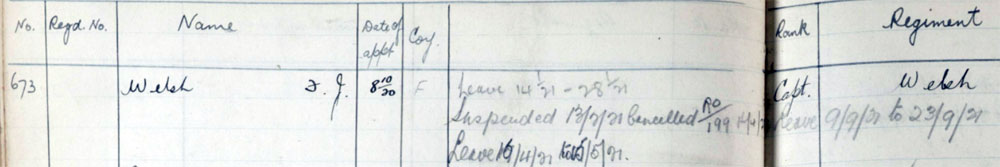 1921 Feb 14 to 16 Apr. He was suspended over his part in the Drumcondra Murders, for which he, Hinchcliffe and King were initially charged. The charges against Welsh were dropped before it got to the Cout MArtial for unknown reasons. The prisoners were murdered on 9th Feb, and charges against him were dropped on 13th Apr (see newspaper articles). His name was given as Frederick J Welsh on charge at Court Martial