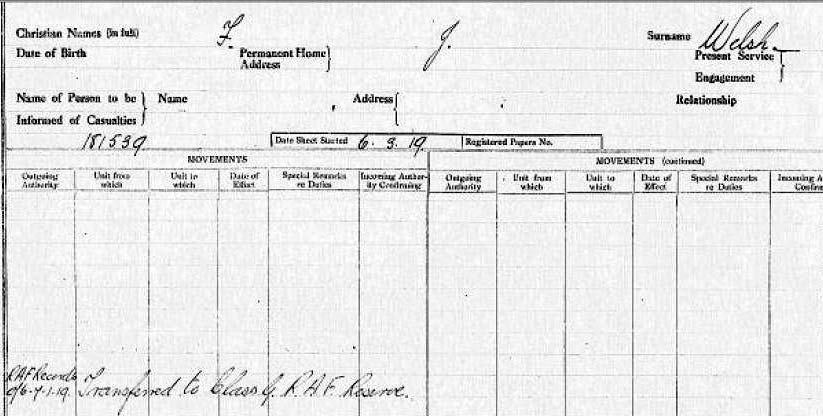 There is also a F J Welsh in the RAF.Record His record just states: F J Welsh ,181539, RAF Records O/C, 7-1-19 Transferred to Class G RAF Reserve. 181539 (a service number Date May-Oct 1918 RAF) Manner of joining the service - Cadets