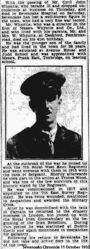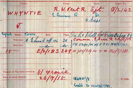 1918 Sep 19 . Won the Military Cross. T./2nd Lt. (A./Capt.) Cyril John Whyntie,. 8th Bn., E. Surr. R. For conspicuous gallantry and leadership near Ronssoy on the 18th September, 1918. He held his company well together in the dense mist and kept them straight on their objective. Owing to the failure of troops in front to take the Green Lane the company soon found itself in the front line and met with heavy machine-gun fire. He at' once extended his company and pushed on, thereby gaining two thousand yards of ground and reaching the Green Line.