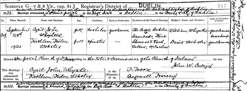 1921 Sep 28. Married in Dublin to Helen Webster