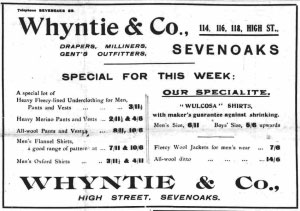 1935 Oct/Dec Died Sevenoaks, Kent aged 41. Jack Whyntie was taken ill suddenly when preparing to close the shop one Thursday evening in 1935 and died of meningitis on his forty first birthday on the following Saturday 5th October. He was buried in Greatness Cemetery. His brother Fred, who had served as an Air Mechanic during the war, survived him by only two years, dying in 1937, followed the year after by their mother, aged seventy one. William Whyntie, the patriarch of the family, lived on until 1948 when he died aged eighty eight and was survived by his daughters and grandchildren.
