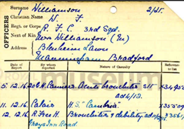 1916 Apr 22. Commissioned 2nd Lt in RFC as "William Fairbank Williamson". He got a post war pension for "nervous instability"