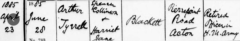 1885 Apr 23. birth at Acton , Middlesex, the son of Spencer Collison Blackett, an army officer.