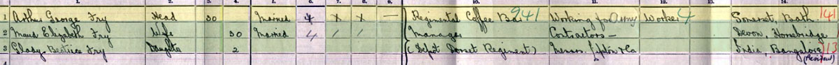 1908 Oct 25 Daughter Gladys Beatrice born Bangalore, Karnataka, India (she is th only one of his three children to reach adulthood. She married Edgar Charles Conway de Waterford in Hampstead in 1929 and died 1972 in Hillingdon)