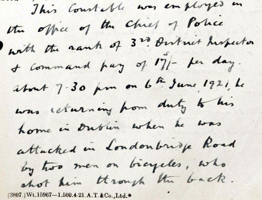 Mr. A.G. Fry, District Inspector of the Royal Irish Constabulary, was awarded £1,600 compensation for injuries caused by being shot at London Bridge, Bath Avenue, Dublin on the 6th June 1920.