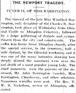 The funeral of Winifred Barrington took place to Abington cemetery. A report of the funeral, including a generous tribute to 'the amiable young girl' was published in the Limerick Chronicle on 19 May. The report stated: 'Passing through the village of Murroe all houses were closed and blinds drawn. The bell of the Catholic Church tolled mournfully until the end procession passed out of sight'. She was buried in Abington Church of Ireland on , Wednesday, May 16th, 1921. Her parents did not allow her brothers to come to Ireland for the funeral owing to the disturbed state of the country. The stone above her grave bears the following inscription: "Here lies all that could die of Winifred Frances Barrington ".
