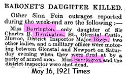 Sir Charles Barrington came home from the station on the afternoon, May 14th. His daughter greeted him, and then out for tea, riding her white pony accompanied by a lady friend riding a bicycle. At the outside gate Mr O'Brien, who guessed where she was going, tried to stop her: "I am soldier myself, but I would not dare to speak to those soldiers across the street", he said. She replied that having been in the ambulance service and in the Flying Corps during the during the Great War she need not fear anyone. And she went on. She was dressed in a riding outfit and officer's cap, and could have been mistaken for a man.