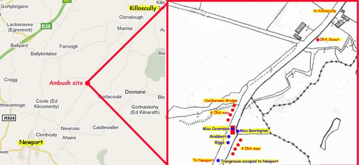 On reaching Coolboreen Bridge near Newport the motor car was fired ambushed by a party of armed IRA men led by Sean Gaynor, Miss Barrington and the district inspector being fatally wounded, while Captain Gabbett surrendered and Lieutenant Trengrouse escaped down the road.