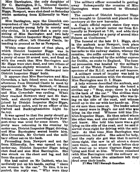 McGrath, Ryan and myself went up to the car, where he found, unharmed, an English woman named Rivers [her name was in fact Coverdale]. She was by no means frightened, and proceeded to give us "dog's" abuse for having shot Miss Barrington. Miss River's language upset me somewhat, but Ryan quickly silenced her when he said "Only for the bitch being in bad company she would not be shot!" The car was searched but it contained nothing of interest to us. The man who had fallen in the centre of the road turned out to be District lnspector Biggs, and he was dead. Miss Barrington was badly wounded, having been shot through the lung. We got the women in nearby houses to take her in and render whatever aid they could. She died in a few hours.