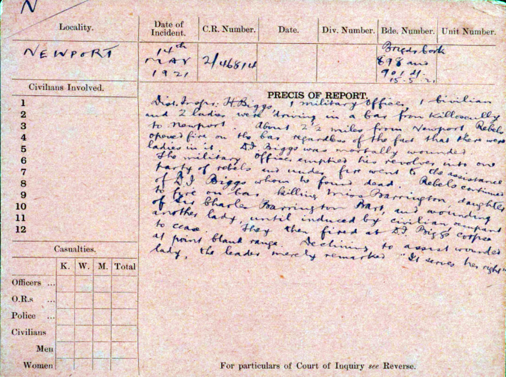 [Mr Gabbett] stated he was in Newport on the 14th, when he was overtaken by Miss Barrington and the other young lady. Eventually they were joined by Captain Biggs and [Lt Trengrouse], and set out in Biggs's motor car for a house where they had tea. They left about seven o'clock on the return journey, and when they got to Coolboreen bridge, which was three miles from Newport, fire was opened on the car. The motor carried on for a few yards, and then stopped. Captain Biggs, who was driving, had Miss Barrington beside him, and he appeared to be hit. Witness saw Miss Barrington tumble out of the car on to the side of the road, and he thought that she must have been also hit then. Captain Biggs got out of the car and advanced about twenty yards up the road and then fell. Witness and [Lt Trengrouse], also got out, and he saw [Lt Trengrouse] on the road with his revolver in his hand. Witness started to crawl in the direction of Captain Biggs, the other lady remaining in the car. The firing was going on all the time on his right and left and from behind. Witness next heard [Lt Trengrouse] ask Capt. Biggs if he could help him, but he received no reply. [Lt Trengrouse] then turned Biggs over and eventually he thought he saw [Lt Trengrouse] fire two or three shots. Biggs and [Lt Trengrouse] were in civilian clothes. While the firing was going [Mr Gabbett]saw some men come out on the bridge, and he shouted to them to stop firing, that there was only a girl in the car. At this time he had his hands up, and he next saw about twelve men on the road. One of them said to witness "You have a pistol in your hand", and he replied that it was only a pipe. Witness then removed his gloves and was covered by two men with revolvers. The leader asked where was Biggs, and witness said he was lying on the road, and that the only person in the car was a lady. While on the roadway ten or twelve shots were fired from rifles into the body of Captain Biggs, one man remarking that he was the man they wanted. The attacking party could have seen that there were ladies in the car when fire was opened on it. The men then went back to the motor near where Miss Barrington was lying, and one said something about being sorry and another said it was better for them to disperse. All of the men had rifles except one who had a revolver. When Miss Barrington was being removed he noticed her right leg badly shattered, as if she was struck by an expanding bullet.