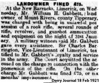 An article by P Ryan, that he sent me said. The rapid onset of darkness at 19.00 was a consideration at the ambush scene. A number of locals always contended that the IRA had prior knowledge of Biggs’ intended fishing visit to Ciamalta House, the residence of Major Kingscote . Kingscote and Harry Biggs had both served in France with the British Expeditionary Force and afterwards in Salonika. Salonika was a small confined theatre of war and I suspect, but cannot prove, that they knew each other. There was a local tradition that prior knowledge of the proposed trip came from Mount Rivers, the residence of Captain Gabbett . The Gabbetts were considered ultra Loyalist and their house had been one of the most secure safe houses for the IRA in the area and was often used as an arms cache. No military raids were conducted on the house until the arrival of Biggs. He was more thorough than his predecessors and, during a raid on Mount Rivers in January, 1921, captured rifles and ammunition. In light of what subsequently occurred it was ironic that at a Military Tribunal in Limerick, where Captain Gabbett was charged, Sir Charles Barrington testified to Mr Gabbett’s loyalty and army service. Sir Charles attributed the occurrence to carelessness on the part of Captain Gabbett, implying, probably correctly, that the staff members were responsible. Gabbett, however, was fined £75 . The real culprit, or more correctly, the scapegoat was Mary Fenton, the cook at Mount Rivers. She was imprisoned in Limerick and was still there in April, 1921, awaiting trial . Mary Fenton’s sister Nora was the parlour maid in Mount Rivers and it is possible that it was through her that the IRA became aware that Miss Barrington and her friend were to call on Saturday afternoon to Gabbetts to join Biggs and his friend and, together with Captain Gabbett, the entire party would visit Major Kingscote for afternoon tea. A possible explanation is that the local IRA unit misled Gaynor concerning their prior knowledge. By his own account, Gaynor did not have a good relationship with the Newport and Rearcross IRA. They, in turn, may have resented his interference and kept him in the dark about aspects of their operations.