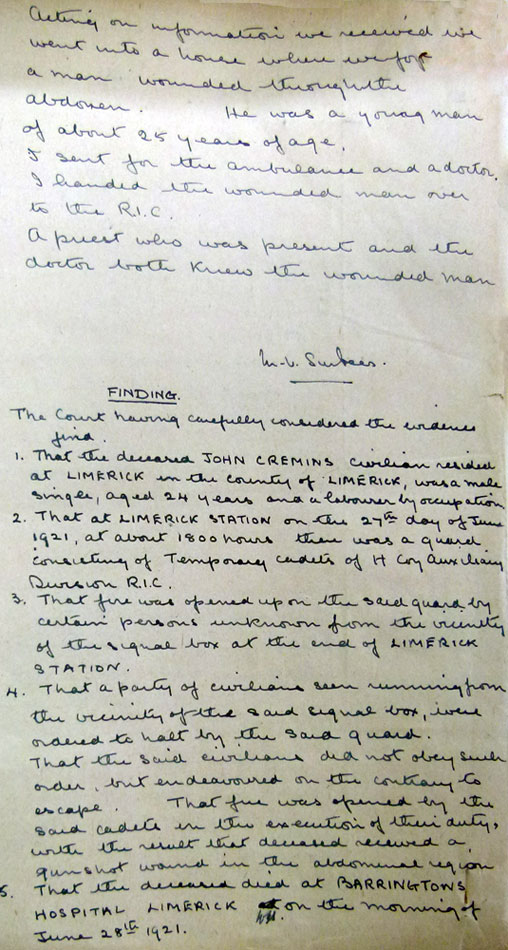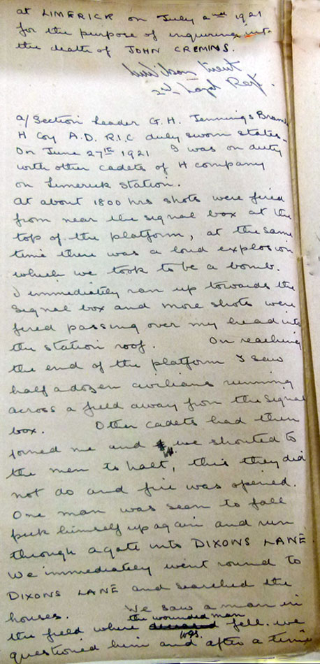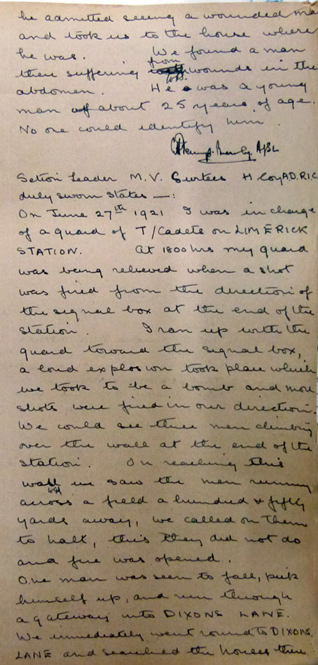 Men from H Coy were at Limerick Station on 27 Jun. Among them were S/L GHJ Bramley, S/L MV Surtees. There were two sections as the guard at the station was being changed. There were shots and an explosion from near the signal box. And men started running away from the area. The Auxiliaries called on them to stop, and when they did not, opened fire. One man John Cremins was hit and died. Oddly nothing appears in IRA statements, so Cremins must have been a civilian, but who the men in the signal box were, I have no idea