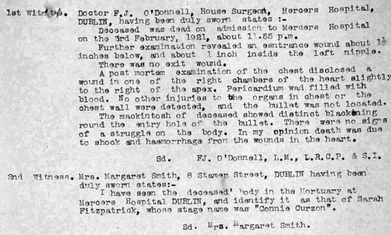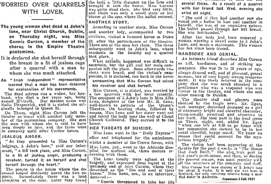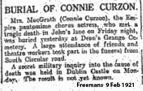 A strange tale in which Sarah Fitzpatrick died. She used a stage name of Connie Curzon, and was buried as Mrs MacGrath - her husband was said to have died in tragic circumstances about 2 years previously