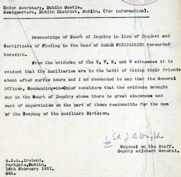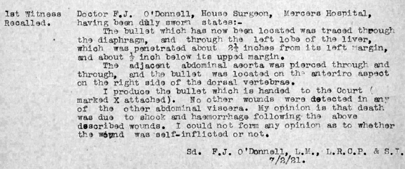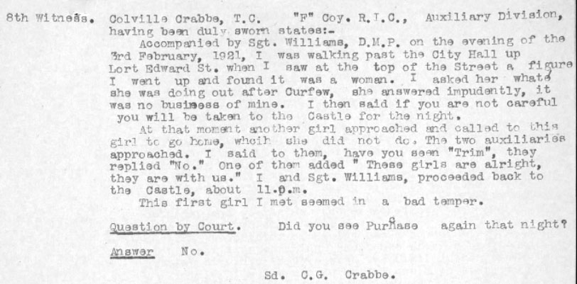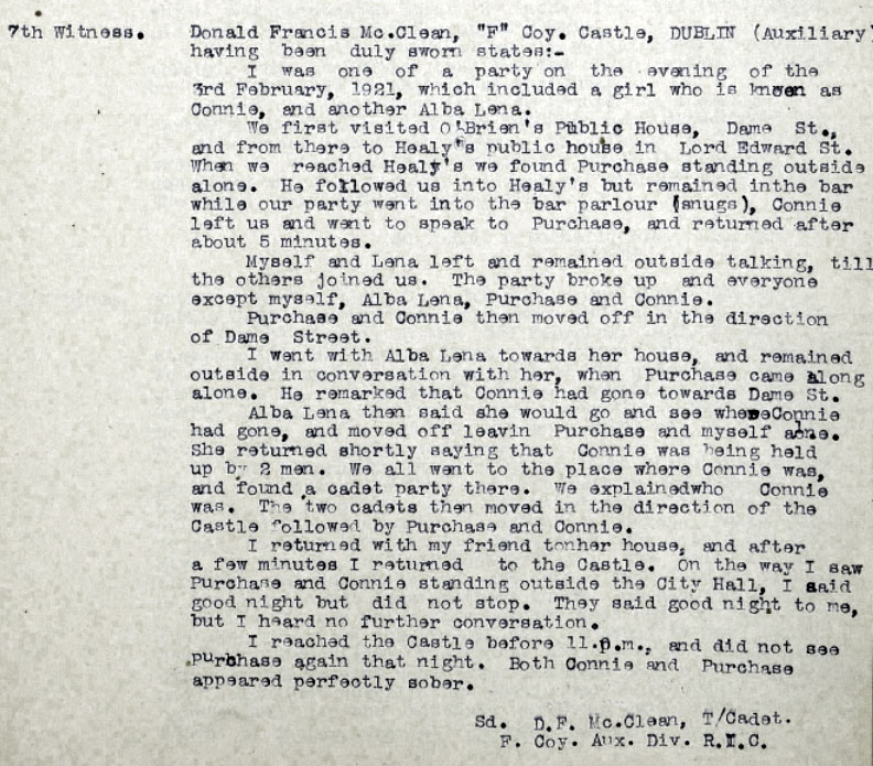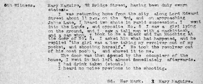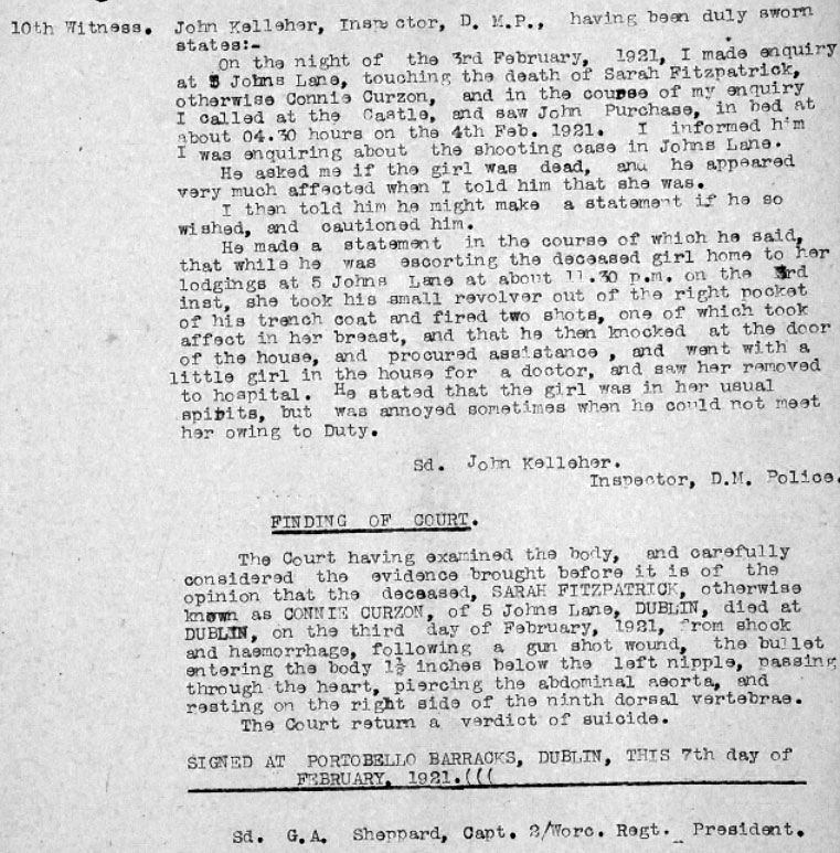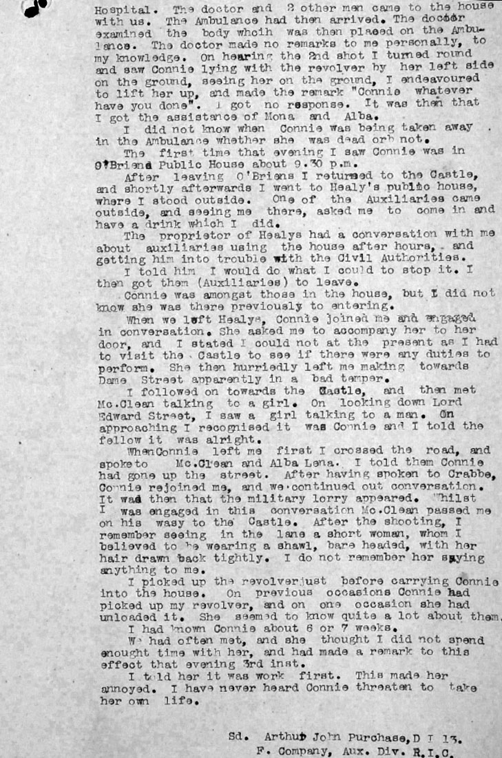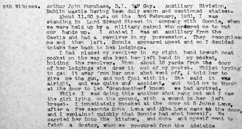 At a point in Healy's DI3 AJ Purchase arrived, and appears to have warned off the ADRIC with Connie, and taken over as her escort. They left Healy's around 11. Between 11 and 11.30 Sarah was stopped by T/C CE Crabbe and Sgt Williams of DMP. 2 shots were fired by Purchase's revolver between 11 and 11.30. One hit Sarah. Sarah was admitted dead to Mercers Hospital about 11.55pm