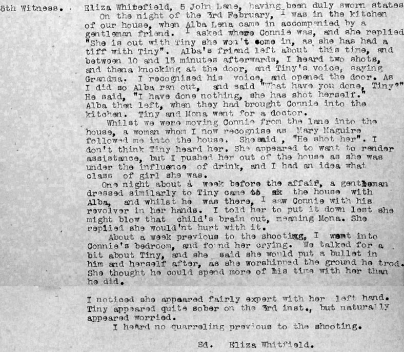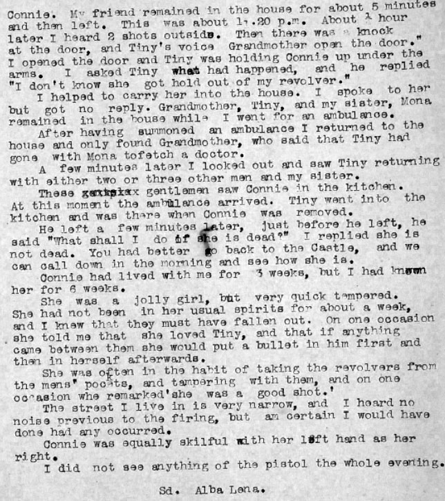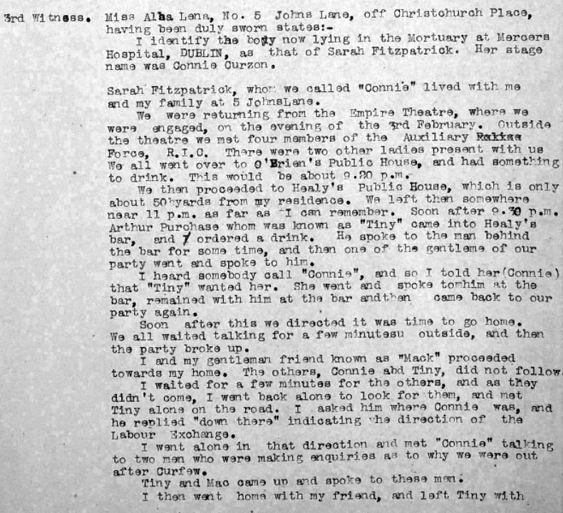 Sarah Fitzpatrick (known locally by her stage name of Connie ) was lodging with Alba Lena and her family. Alba Lena was also on stage with Sarah Fitzpatrick at the Empire Theatre, Dublin that night) Sarah, Alba, and two other women met 4 ADRIC outside the theatre and went drinking with them around 9.20pm. They started at O'Brien's Pub, and went on to Healy's Pub - they eventually left Healy's about 11pm. Another "pair" that night was T/C DF McClean and Alba Lena and both gave evidence. Alba had a sister Mona Lena who also gave evidence.