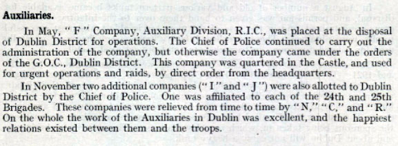 1921 May 25. Custom House burning. Evidence to the inquiry was from DI3 HHR Towse of Q Coy who took 12 men in a lorry plus another detachment on foot and DI2 KF Crang of F Coy with 3 tenders of Auxiliaries plus an Armoured Car