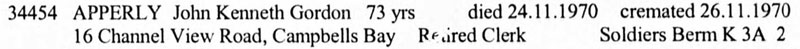 1969 Electoral Roll at 16 Channel View Rd, Waitemata, Auckland. He is "retired" and living with Florence Apperly.
