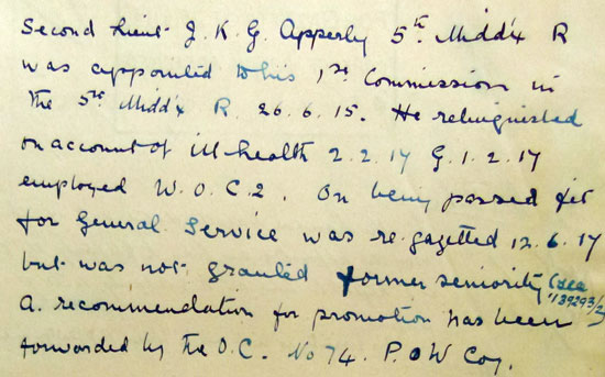 1918 Mar 6 Labour Corps. 2nd Lt. J. K. G. Apperly (Midd'x R., Spec. R.) is apptd. to the Corps. with seniority 12 June 1917