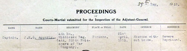 1919 Apr 22. Labour Corps. The undermentioned relinquish the actg. rank of Capt. on ceasing to be empld. with the Corps . Lt. J. K. G. Apperly (5th Bn., Midd'x R., Spec. Res.).