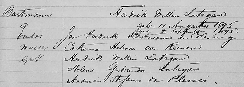 1895 Sep 5 Baptism Place Colesberg, Cape Colony, South Africa Birth Date 11 Aug 1895 Parent Name Jan Fredrik Bartmann Second Parent's Name Catherina Helena Van Reenen