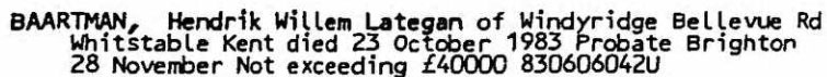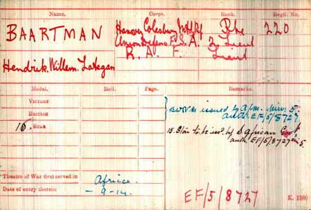 1895 Jul 11. Born South Africa Son of JF Baartman, Colesberg, Cape Provence. His father died in 1941, a retired General Dealer
